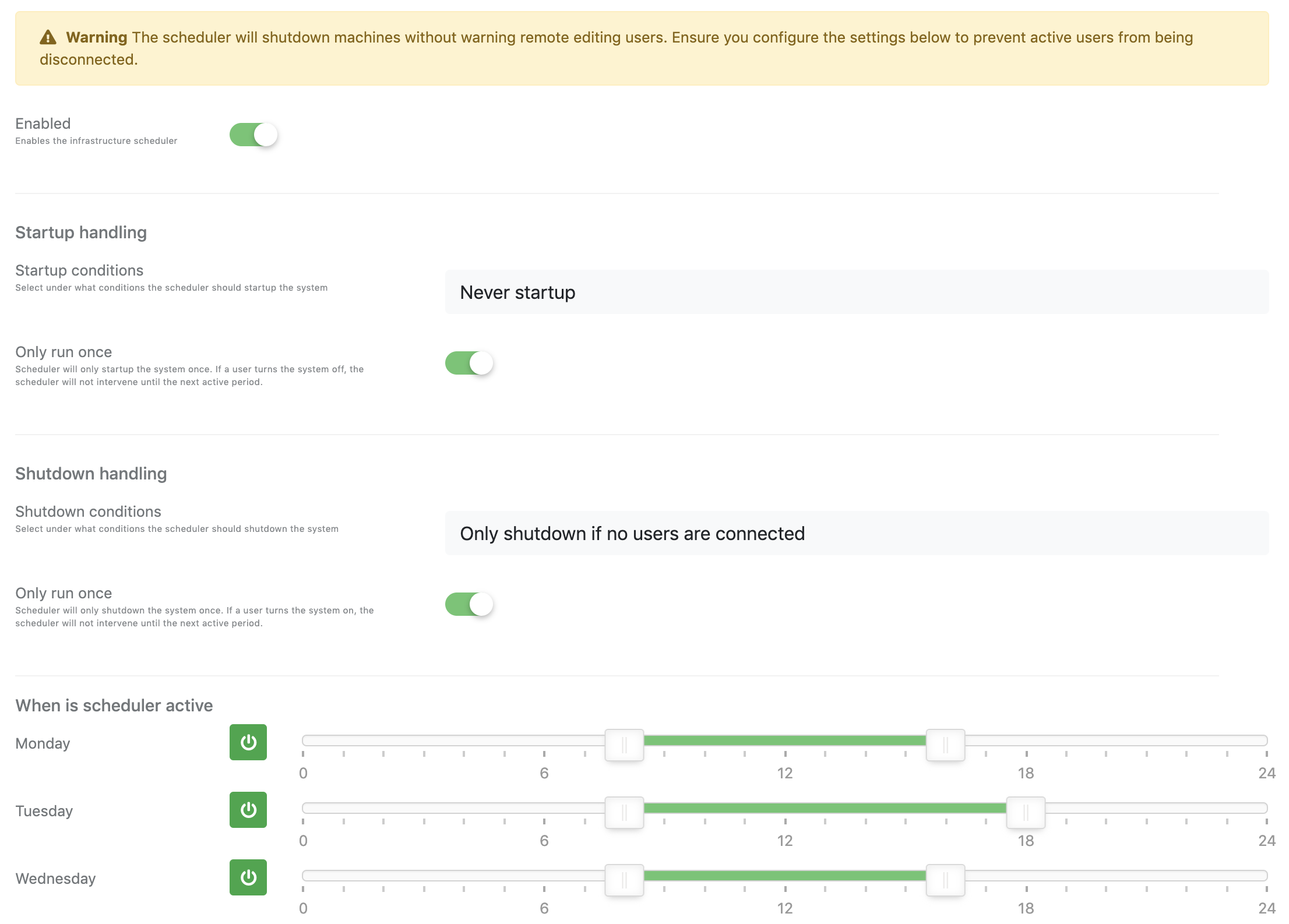 One of the core elements of the Remote Edit Dashboard is the ability to schedule infrastructure to startup and shutdown automatically. This provides vast cost savings when using platforms such as AWS which charge for the amount of time an instance is running for. The Remote Edit Dashboard can be configured to suit different requirements and environments. When the infrastructure scheduler shut down the system, it will turn off all workstations first without any warning to users. To access the scheduler settings, go to: