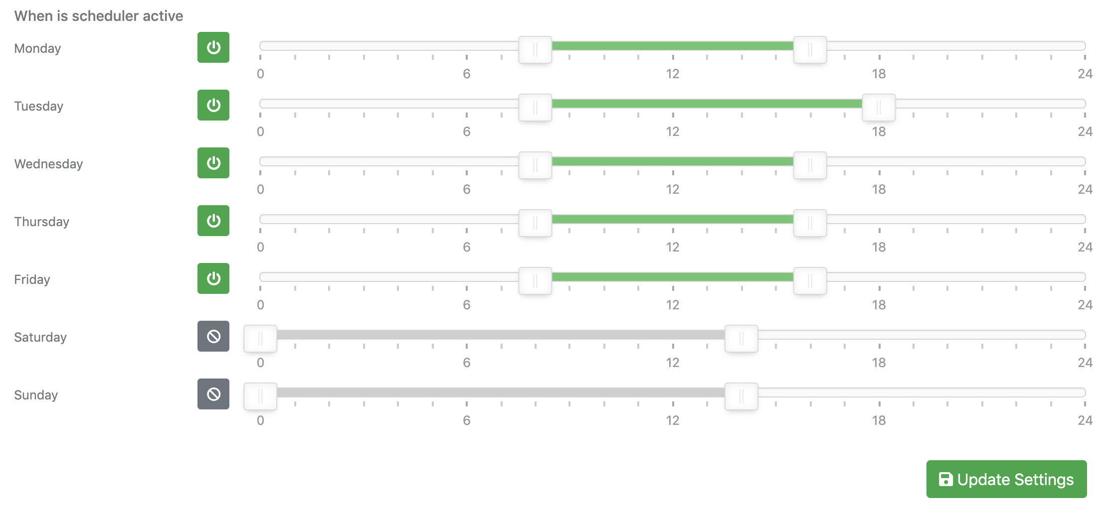 The scheduler can be configured independently for each day of the week. Days can also be marked as disabled to prevent the scheduler from taking any action. The green bars in the image above indicate the systems operating hours (where the scheduler will turn on the system), and outside operating hours (where the scheduler will turn off the system). Greyed out bars indicate that the scheduler is disabled for that particular day. The numbers on the sliders indicate hours in 24-hour format.