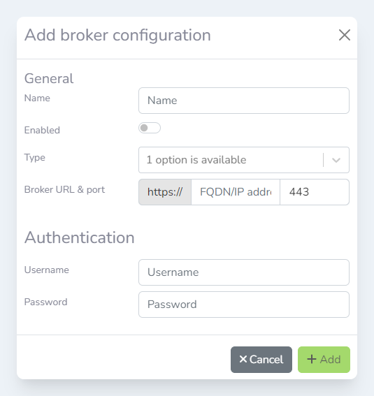 field, enter a friendly name for the broker. This can be anything you like.Decide if this broker configuration is enabled, but toggling the