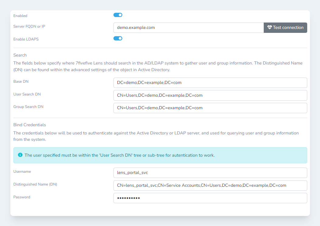 field, enter the FQDN for the Active Directory domain the Lens Portal should contact. You may also add the IP of a specific domain controller.If you require LDAPS, then check the