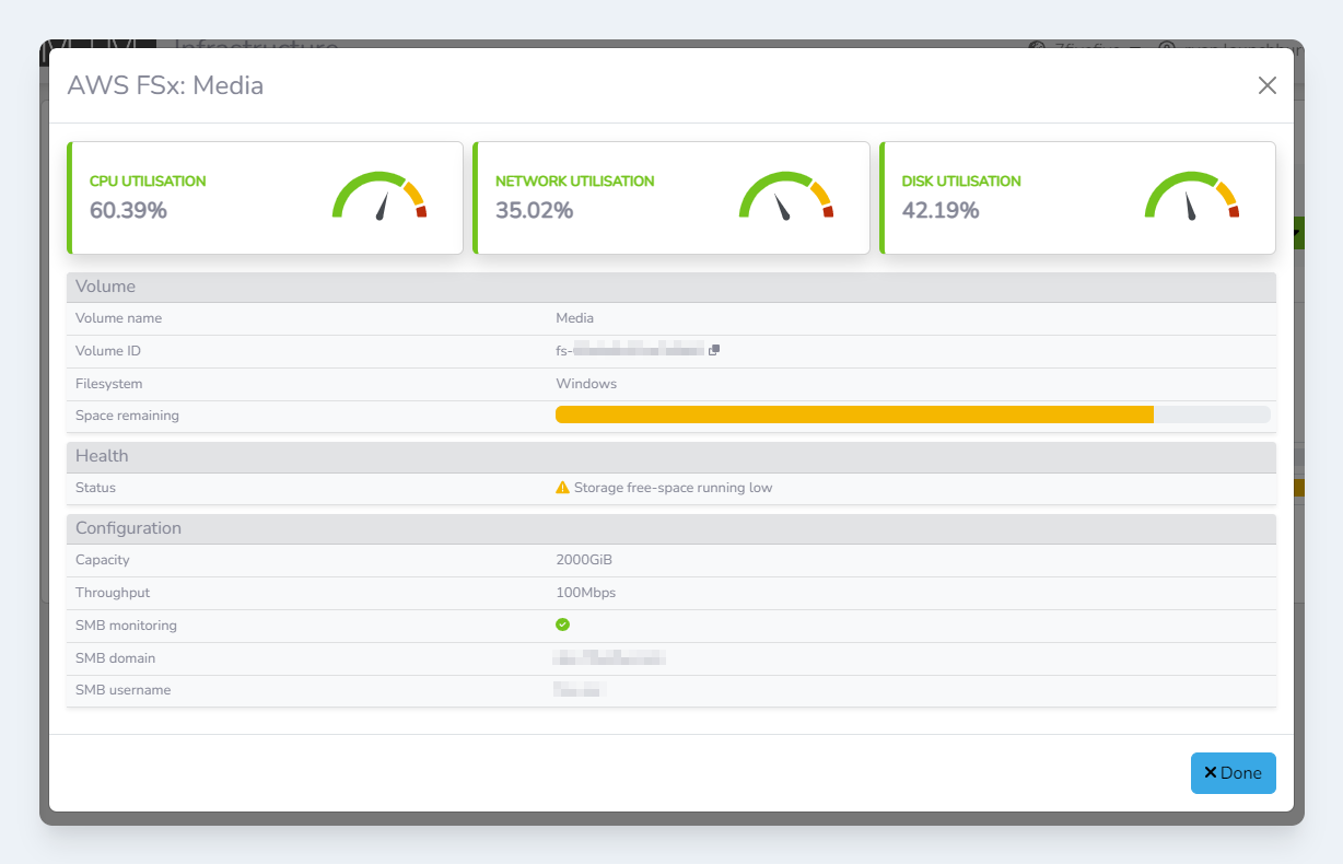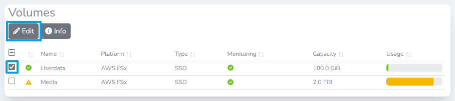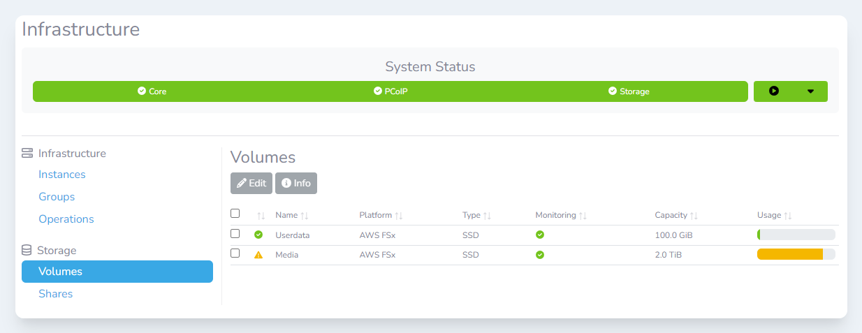 Storage volumes are the top-level item that we monitor. A volume may be a storage cluster or a cloud storage service. For example, a single AWS FSx volume is a volume in Lens. A single volume can often have multiple file shares configured, allowing a volume to be used for many different workflows.
